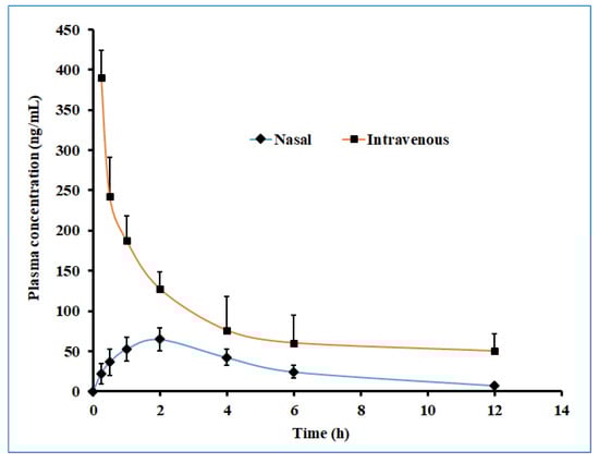 Figure 13 displayed the plasma drug concentration–time profile of darunavir after administration by nasal and intravenous routes. It is apparent from Figure 13 that a high drug level in the plasma was yielded with the intravenous route as compared to intranasal delivery. Nevertheless, the calculated AUC0-α in the intravenous route was ~3 fold larger than the AUC0-α obtained for the intranasal route. The low drug plasma concentration–time profile observed with intranasal delivery suggested the low systematic exposure of darunavir through the paracellular transport mechanism. Lower Cmax and AUC0-α values were noticed with the nasal application (compared to a similar dose of darunavir given after intravenous administration (Table 5)), signifying the low absorption of the drug into the central compartment.