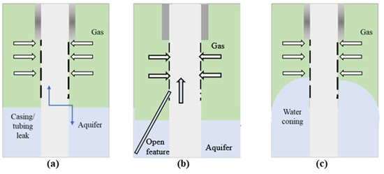 Figure 1. Sources of excess water in gas production wells, (a) Casing/tubing leak, (b) Open fracture, (c) Water coning.