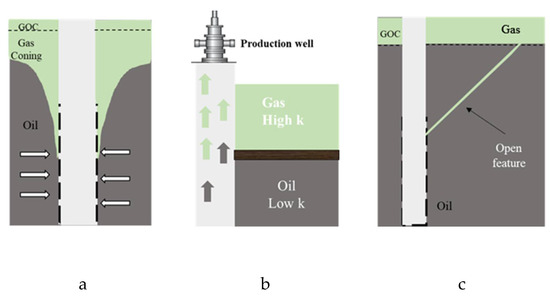 Figure 2. Sources of excess gas in oil production wells, (a) Gas coning, (b) High permeability contrast, (c) Open feature.