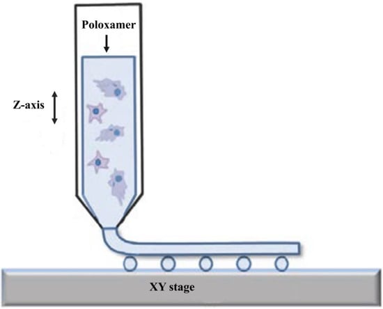 The printer controls the temperature during input and output to ensure changes in the flow behavior of the poloxamer; therefore, the poloxamer acts as a bio-ink to adjust the 3D-printing conditions to obtain a suitable product []. The printing equipment consists of a heated dispensing head terminating with a nozzle, an XY stage for the positioning of the dispensing head, and z-axis for controlling its distance from the stage (Figure 5). The cells were well distributed in the scaffolding filaments, and cell viability was maintained throughout the 3D-printing process []. The purification/modification process can alter the rheological properties of poloxamers. Tuning rheological properties according to the desired conditions for injectable scaffolds and 3D printing has also become a popular research topic.