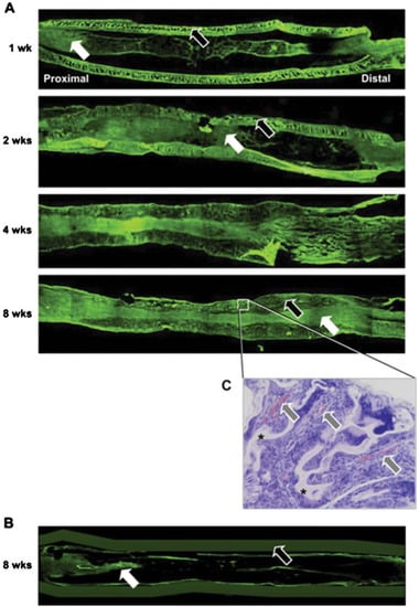 Nerve regeneration using (A) PLGA/F127 and (B) silicone tubes (white arrow shows regenerated nerve; black arrow shows tube wall) and (C) cross-sectional perspective of PLGA/F127 tube wall exhibiting the presence of blood vessels infiltrated within the wall. Gray arrow denotes blood vessel; * denotes PLGA/F127. The image has been taken from the publication by Kim et al. [] with permission.