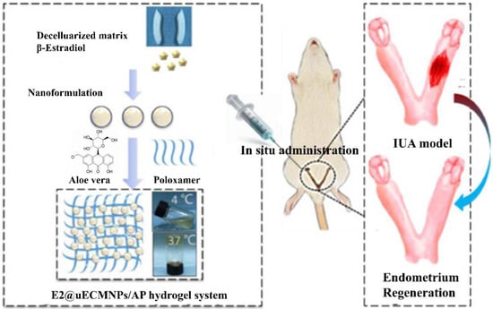 The poloxamer hydrogel is liquid at low temperatures, which is below 20 °C and has favorable injectability. The hydrogels will solidify when put into the uterine cavity or heated to 37 °C. Through the curing process, a hydrogel system can improve nanoparticle dispersion stability and greatly reduce agglomeration. Furthermore, several investigations have shown that poloxamer hydrogels exhibit good stability. In the early stages of damage, the hydrogel acted as a physical barrier. Decellularized uterus-derived nanoparticles (UECMNPs), β-estradiol (E2), aloe-poloxamer (AP), and other elements can function together to promote healing and endometrial regeneration (Figure 9) []. The hydrogels can not only supply E2 to the injured location but also have a synergistic effect on wound healing and repair of the damaged uterus’s morphology, structure, and function. Hydrogels have the ability to boost the concentrations of drugs in the target region while also extending the action time. Under the action of the poloxamer hydrogel, damaged cells can promote cell proliferation and self-repair, and cell activity is obviously enhanced.