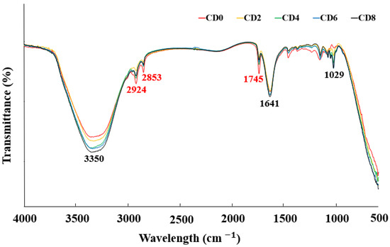 Fourier-transform infrared (FT-IR) spectra of the emulsion gels. The konjac (4%, w/w) emulsion gels were supplemented with various concentrations of cyclodextrin (CD; 0–8%, w/w). The peaks detected at wavelengths 3350 and 1641 cm−1 indicate O-H stretching, while those detected at 2924 and 2853 cm−1 indicate -CH2- stretching in long-chain fatty acids. The peaks detected at wavelengths of 1745 and 1029 cm−1 indicate C=O stretching in fatty acid esters and C-O stretching vibration in anhydro-glucose units, respectively (n = 3). Red, CD0 (0% CD-supplemented konjac-based emulsion gel); yellow, CD2 (2% CD-supplemented konjac-based emulsion gel); green, CD4 (4% CD-supplemented konjac-based emulsion gel); blue, CD6 (6% CD-supplemented konjac-based emulsion gel); black, CD8 (8% CD-supplemented konjac-based emulsion gel).