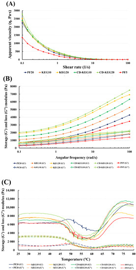 Rheological properties of emulsion gel-supplemented meat batter. (A) Apparent viscosity at 10 °C, (B) viscoelasticity as a function of frequency in the range of 0.1–100 rad/s at 10 °C, and (C) viscoelasticity during temperature sweep at 25–80 °C, 1 Hz, and 0.5% strain. Each colored line represents the rheological properties of the gel-supplemented sausages (n = 3). Navy, PF20 (20% pork backfat); orange, KEG10 (10% pork backfat + 10% konjac-based emulsion gel); yellow, KEG20 (20% konjac-based emulsion gel), green, CD-KEG10 (10% pork backfat + 10% cyclodextrin (CD)-supplemented konjac-based emulsion gel); light green, CD-KEG20 (20% CD-supplemented konjac-based emulsion gel); red, PF5 (5% pork backfat).