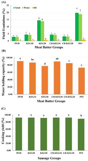 The emulsion stability of emulsion gel-supplemented meat batter is shown in Figure 4A. The emulsion stability of sausages was measured based on the release of total fluids, water, and oil after the application of centrifugation and heat treatment. The emulsion stability parameters were not significantly different between the CD-KEG20 and PF20 groups (p > 0.05). These data suggest that CD-KEG can improve emulsion stability in low-fat emulsion-type sausages. The emulsion stability of the KEG20 group was significantly lower than that of the CD-KEG20 group (p < 0.05). This suggested that CD did not only bond with water and oil in the KEG, also interacted with water and oil in the meat batter. Thus, the supplementation of KEG with CD improves emulsion stability of the meat batter.