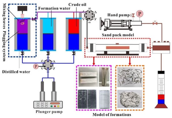 The prefabricated different reservoir models were loaded into the displacement system, and the experimental flow of plugging and enhanced oil recovery displacement is shown in Figure 1. The formation water was pumped into the model to measure the initial permeability (Ki), the fracture opening was adjusted by changing the particle size of ceramsite, and the number of screen bars was increased or decreased to alter the pore-fractured reservoir model. For each reservoir model, first, a plunger pump was used to saturate the model with water at 0.5 mL/min and record the steady pressure Pi. The injection rate was maintained and 0.5 PV of the plugging system was injected into the model to be tested. After the plugging system was injected, it was transferred to the formation water injection until the pressure was stable.