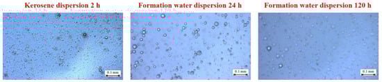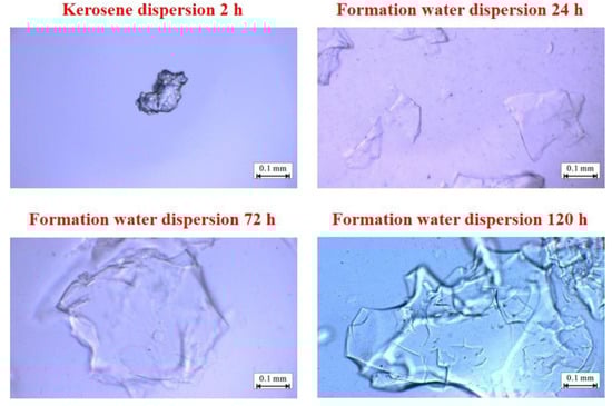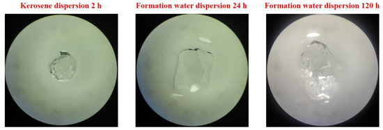 The particle size test results of bulky particles dispersed in formation water and kerosene are shown in Figure 4. When sampling the bulky particle dispersion system, an apparent layering phenomenon was found, and reliable sampling could be carried out only after stirring. The swelling particle samples continued to expand within 120 h, the expansion rate decreased with time, and the particle size grew from 5 to 10 mm.