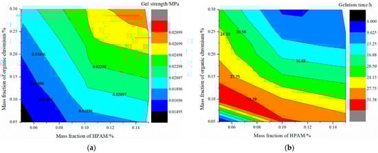Contour diagrams of static performance of organic chromium gel: (a) gel strength, (b) gelation time.