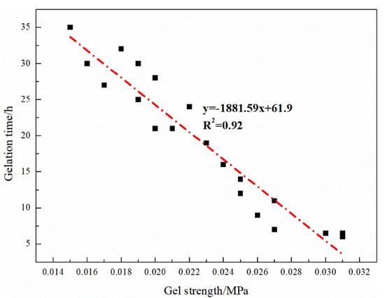 After HPAM was dispersed, it was a uniform viscous colloidal fluid. No residue was seen at the bottom of the bottle, indicating that it had good adaptability to the formation water with high salinity. The breakthrough vacuum degree and gel formation time of the gel is shown in Figure 5. With the increase of the mass fraction of HPAM and organic chromium cross-linking agent, the gelation time of the gel was shortened, and the strength of the gel was increased. When the mass fractions of HPAM and organic chromium crosslinking agent are 0.05–0.15% and 0.05–0.25%, respectively, the gelation time is 11–35 h and the gel strength is 0.015–0.027 MPa.