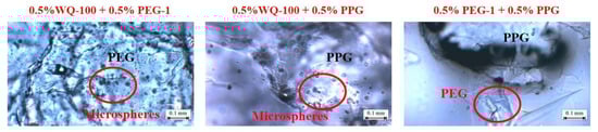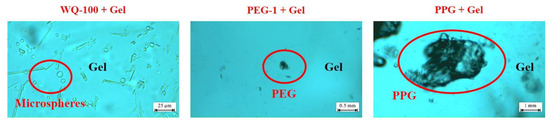 The microscopic test results of the enhanced gel systems are shown in Figure 10. The dispersion performance of the WQ-100 system gel is the best and it is evenly distributed. Compared with WQ-100, PEG-1 and PPG are both observed to have obvious granularity, indicating that the dispersion effect of PEG-1 and PPG is poor.