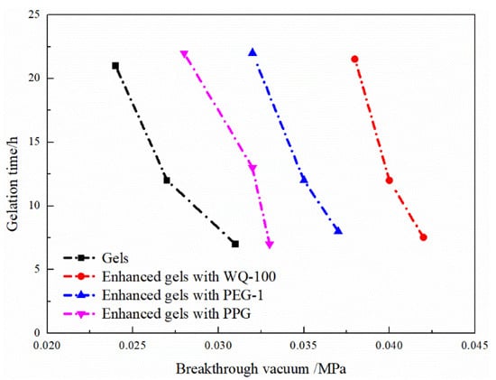 The gelation time and strength of the prefabricated gel particles and the polymer gel compound system are shown in Table 4. The relationship between the strength of the composite gel system and the gelation time is shown in Figure 9. Under a certain mass fraction of HPAM and organic chromium cross-linking agent, and with an increased particle size of the added prefabricated gel particle plugging agent, the breakthrough vacuum degree of different compound gel systems under the same gel formation time increases. In particular, the strength of the gel compound system increases more obviously after adding WQ-100.