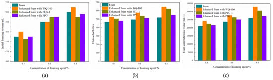 The basic performance of enhanced foam system and single foam: (a) foam volume, (b) foam liquid chromatography half-life, (c) foam composite value.