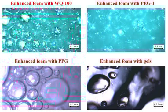 In the microsphere-reinforced foam system, it can be seen that a large number of microspheres are adsorbed on the surface of the bubble particles, the particle size of the bubble particles is concentrated, and the particle size is reduced. Since the microspheres are originally dispersed in the oil phase, the liquid phase is slightly turbid, but the weakening effect of the oil relative to the foaming agent is weak. For microsphere-reinforced foam, the microspheres are uniformly dispersed in the foaming agent solution and form a skeleton structure on the liquid film after foaming. During the foaming process, the microspheres absorb water and expand, which reduces the free water in the liquid film and strengthens the ability of the foaming agent to have interfacial tension. Additionally, the polymer surface has a large number of hydroxyl groups, negative ions appear in free water after dispersion, and the diffusion double electron layer appears, strengthening the repulsion between the liquid films and increasing the foam volume [25]. On the other hand, in the process of liquid film dehydration, the microspheres are dehydrated synchronously, resulting in the slowing down of the water loss rate of the foam on the macroscopic level, which is manifested as the prolongation of the half-life of the foam. The synergistic effect of the two mechanisms greatly increases the comprehensive value of the foam. The liquid film of the gel-reinforced foam system is thicker and there is basically no contact between the bubbles. After the foaming, the liquid phase of the gel is still the main body and the foaming effect of the foaming agent on the gel is extremely poor.