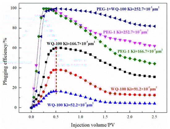 It is worth noting that for millimeter-centimeter PPG, it can be seen from the static performance experiments that it has evident stratification after adding liquid. During the injection and displacement process, the conventional intermediate container was used because a large amount of PPG is deposited or adheres to the top cover of the intermediate container. This can cause injection difficulties and even lead to the experiment’s failure. As shown in Figure 1, the intermediate vessel injected with PPG was upgraded and improved in this study, mild shear was generated by stirring, and the pressure-resistant pipeline was thickened with an inner diameter of 3 mm. The slightly sheared bulk particles are further subjected to extrusion shearing while passing through the injection pipeline, which also improves the PPG injection performance. During the EOR performance evaluation experiment, after saturating the formation water and crude oil in sequence, firstly, the formation water was injected to stimulate the production. The produced fluid was injected into the plugging system after no oil phase flowed out, and then the formation water was injected again until no oil phase flowed out again. During the period, the cumulative oil production was recorded by the oil-water separation metering device, the cumulative oil production injection curve was drawn, and the enhanced oil recovery performance of the plugging system was evaluated. The plugging rate represents the plugging ability of the formation after a particular plugging agent is injected and forms stable plugging. Its calculation theory is as follows: