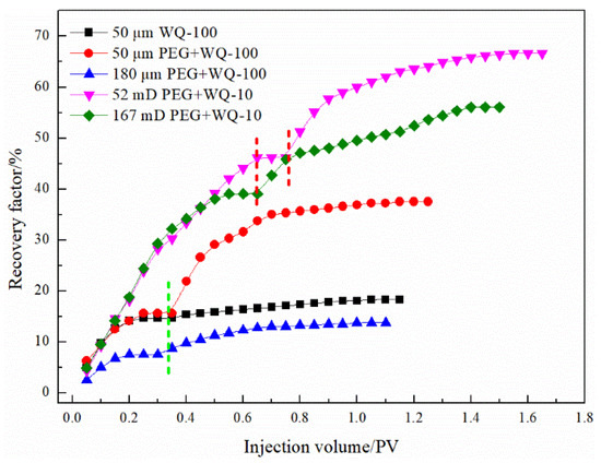 For pore-fractured reservoirs, after the microsphere system is injected into a reservoir with high fracture density, due to the extremely small particle size and good fluidity, the amount of microspheres per unit fracture area decreases and the bridging instability between microsphere particles intensifies. The injected fluid can only perform secondary oil washing near the wall of the micro-cracks, so it enters the failure stage immediately after stopping the injection of microspheres, and the PEG-microsphere system can form a more reliable plugging. The microsphere system improves the oil recovery of porous and fractured reservoirs with permeability by 8.75% and 3.95%, respectively, and the PEG-microsphere composite system improves the oil recovery by 20.52% and 17.08%, respectively, as shown in Figure 16. The addition of the PEG front slug effectively blocked the micro-fractures, and the subsequent microsphere system formed adsorption on the PEG surface and further strengthened the diversion of the injected water to the formation.