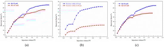 As shown in Figure 16, take the crack width of 50 μm and the PEG-microsphere system as an example; after all the PEG particles were injected, the recovery rate reached 31.56%. The injection of microspheres and the adsorption of PEG particles further blocked the hypertonic channel. In addition, the microspheres entered the low-permeability matrix together with the water phase and elastically deformed in the matrix pores, further producing the residual oil that was not used during the water flooding process. Continued water injection replaced the pre-microsphere slug in the low-permeability reservoir. Because the length of the slug formed by PEG particles failed to seal the entire fracture, the final recovery rate reached 37.50%. For the two reservoir models, the PEG-microsphere system enhanced oil recovery by 21.87% and 6.25%, respectively, and the PPG-PEG system enhanced oil recovery by 27.77% and 21.95%, respectively. The bulky particles have a good ability to control water and profile in fractured reservoirs, and the microsphere system also has a stronger oil washing effect than the single water phase after turning to the matrix.
