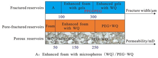 Combined with the static performance, plugging mechanism, and enhanced oil recovery effect of the reinforced gel and reinforced foam systems, a technical chart of the plugging system was constructed according to the characteristics of different heterogeneous reservoirs, as shown in Figure 18. For pore-fractured reservoirs with a permeability of 50–200 mD, considering the stability of injection, the microsphere-reinforced foam system is still preferred to strengthen the plugging of micro-fractures and play the role of micro-spheres in regulating plugging. For pore-fractured reservoirs with a permeability higher than 200 mD, the reservoirs have begun to show obvious fractured reservoir characteristics, so the PEG-microsphere system with good injection performance should be prioritized to plug microfractures. For fractured reservoirs with fracture width less than 100 μm (permeability is about 400,000 × 10−3 μm2 according to the empirical formula, which is affected by porosity in fractures), considering the effectiveness of plugging and reducing injection resistance, the use of microspheres-reinforced foam system or PEG-microsphere system. Considering the stronger mechanical strength of microsphere-enhanced gel, microsphere-enhanced gel can be used in fractured reservoirs with a fractured opening of more than 300 μm to enhance the plugging effect. Alternatively, the formation of bulk swelling particles and PEG particles can comprehensively strengthen the plugging of fractures and improve the fluid flow diversion ability, followed by the use of microsphere flooding to improve the oil washing efficiency of the remaining oil in the low-permeability matrix and comprehensively improve the recovery factor.