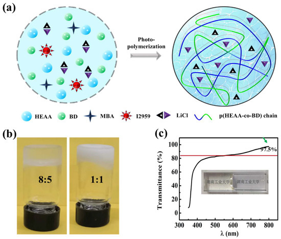On the side, the transparency of the LiCl/p(HEAA−co−BD) anti−freezing conductive hydrogel was measured with a UV−vis spectrometer. As shown in Figure 1c, the transmission of the hydrogel was as high as 80–90% in the wavelength range of 400–700 nm, which was close to the transmission rate of some commercial transparent films. In addition, the Chinese characters (Chinese name of Hunan University of Technology) printed on the paper were clearly observed through the cuvette containing the hydrogel, and the characters of “Hunan University of Technology” were clearly observed. Compared with the blank next to them, there was no obvious blurring of the characters, showing high permeability.