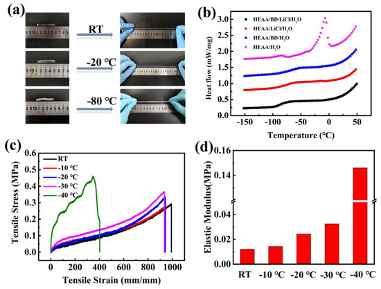 (a) LiCl/p(HEAA−co−BD) hydrogel stretched under RT, −20 °C and −80 °C; (b) DSC curves of hydrogels with different components; (c) Stress–strain curves and; (d) Elastic modulus of LiCl/p(HEAA−co−BD) hydrogel at RT, −10 °C, −20 °C, −30 °C, and −40 °C, respectively.