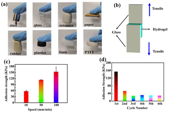 The LiCl/p(HEAA−co−BD) hydrogel possesses excellent adhesion due to it contains a large number of hydrogen bonds. First, the adhesive properties of hydrogel on various non−porous substrates were qualitatively tested. As shown in Figure 3a, the LiCl/p(HEAA−co−BD) hydrogel not only could adhere to inorganic materials such as stainless steel, ceramics and glass, but also can adhere to organic materials such as rubber, plastic, foam and cardboard. In addition to showing adhesion to hydrophilic substances, the hydrogel also adhered to hydrophobic PTFE substrates, overcoming the problem that most adhesives do not adhere to hydrophobic materials. Furthermore, the adhesion strength of the hydrogel on glass substrates was quantitatively tested. Figure 3b shown a schematic diagram of 180° peeling test for exploring the adhesion of hydrogel [34]. The adhesion strength of the LiCl/p(HEAA−co−BD) hydrogel at different peeling speeds is shown in Figure 3c. It can be seen that the adhesion strength of the hydrogel gradually increased from ~60 KPa to 150 KPa as the peeling speed increased from 10 mm/min to 100 mm/min, showing obvious speed−dependent properties.