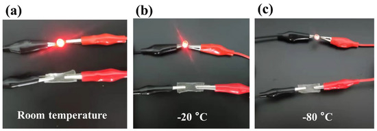 The conductivity of the LiCl/p(HEAA−co−BD) hydrogel was tested by serially connecting it into the circuit of a battery with 8V at RT, −20 °C and −80 °C, respectively. The results were shown in Figure 4. The hydrogel not only had excellent conductivity at RT (LED emitted bright light), but also possessed conductivity at a low temperature (LED can be lit). Among them, since LiCl can be hydrogenated to freely mobile Li+ and Cl− at RT, which can allow the hydrogel to exhibit conductive ability, the LED in the path exhibits bright emission. With the decrease in temperature, the decline in mobility of hydrated Li+, resulting in the decrease in the conductivity of hydrogel.