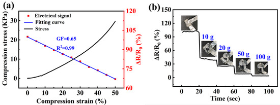 (a) Compression stress and compression strain and (b) Resistance changes of hydrogel response to different weights.