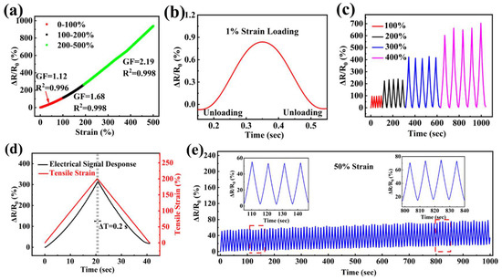 (a) GF of the LiCl/p(HEAA−co−BD) hydrogel flexible sensor. The change of relative resistance of the hydrogel flexible sensor during the loading–unloading cycle with a strain of (b) 1%, (c) 100–400%. (d) time−resolved responses of hydrogel flexible sensor. (e) The stability of the hydrogel flexible sensor.