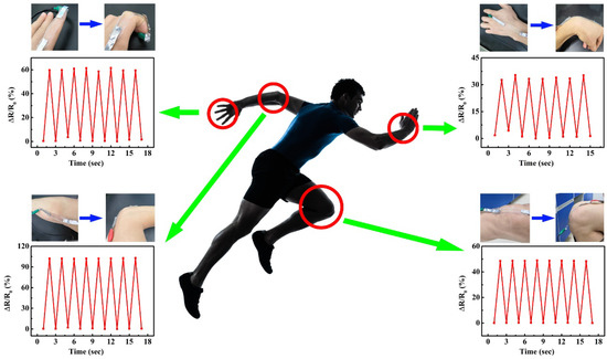 In view of the high tensile property, good electrical conductivity, adhesive property and strain response capability of this anti−freezing hydrogel. A flexible wearable sensor for monitoring human motion was prepared based on the LiCl/p(HEAA−co−BD) hydrogel. As shown in Figure 7, the hydrogel based flexible sensor was directly adhered to each joint of the human body. Then, the human movement signals were collected by an electrochemical workstation. The results showed that the relative resistance of hydrogel varied from 0 to 60% with the stretching and bending of a finger, and when the wrist, elbow, and knee were straight and bent, the relative resistance changes of the hydrogel were 30%, 100%, and 50%, respectively. Since the relative deformability of fingers and elbows is greater than that of wrists and knees, the relative resistance of hydrogels changes more obviously with bending deformation.