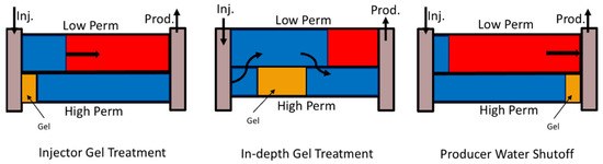 In situ gel is a widely applied gel treatment agent that can efficiently improve the injection profile and sweep efficiency during the driving phase [3,7,8]. The basic operational process for this technology is to pump the polymer solution and crosslinker as a mixture solution, called gelant, into the formation. Then, the well is shut in for a certain time to ensure in situ gelation sufficiently takes place. During this period, the slug of gel as a permeability modifier or barrier in the preferential water channel forms. Finally, the well opens and the subsequent water drive is diverted to the un-swept zone. Based on the location of the gel placement, the treatment can be categorized by profile control at injection wells, in-depth flow diversion, and water shutoff at production wells, as shown in Figure 1.