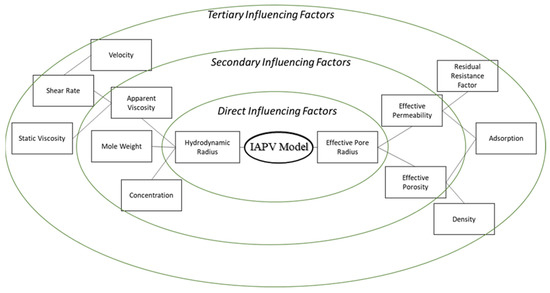 To summarize our novel IAPV model, Figure 2 shows a diagram that displays influential factors on the IAPV. The inner green circle contains these factors, which include the hydrodynamic radius and effective pore radius, both of which directly influence the IAPV based on the theoretical thermal dynamic model. The middle green circle rounds the secondary factors, including apparent viscosity, mole weight, concentration, effective permeability, and porosity, which influence gelant hydrodynamic radius and pore radius. The outer green circle concludes that the extended factors influence the secondary factors. These factors include static viscosity, shear rate or velocity, residual resistance factor, adsorption, mole weight, and density. Deployment of the new model requires the calculations of factors from outer circles to inner circles.
