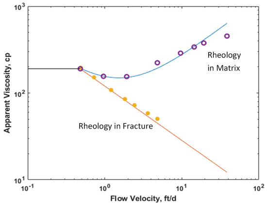 To test the sensitivity of flow velocity on IAPV, gelant rheology was considered. We provided a set of gelant rheology data, as shown in Figure 4. Due to the unstable viscosity of gelant mixtures, the rheology data (orange solid circle: in fracture; and purple circle: in matrix) was measured using 5000 ppm HPAM polymer, which was very similar to the gelant at injection stage. The rheology response in the matrix was measured in the coreflooding experiment, and the rheology response in fracture was measured using a viscometer. The static viscosity (black curve) equaled to 190.36 cp, which was measured at the lowest flow velocity, 0.48 ft/d. Curves are simulated results fitting the lab results.