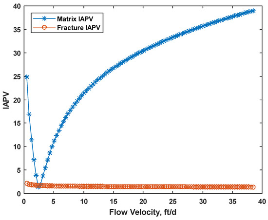 We tested the range of velocity from 0.48 ft/d to 38.49 ft/d. Considering constant adsorption 200 with Frr = 1.5 (no gel formed), K ratio = 100, MW = 20 MMD, the IAPV results of both the matrix and fracture are shown in Figure 5. We observed that the matrix IAPV increased quickly at a high flow velocity period, but the fracture IAPV did not significantly increase in the fracture.