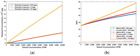 During gelant placement, the effective porosity decreased due to gelant retention. Figure 6 shows the effect of retention capacity on IAPV. We observed that even if a linear retention (retained concentration increased linearly with gelant concentration) was applied, the IAPV nonlinearly increased. Moreover, Figure 6b shows that for the relative low level of retention capacity (blue and red line), the increasing rate of IAPV for the high gelant concentration mildly decreased, yet for the high level of retention capacity (yellow line), the increasing rate increased for the high gelant concentration. This was due to the numerical feature of Equation (13), which indicates that, for higher retention capacity gel, the IAPV can exponentially increase.