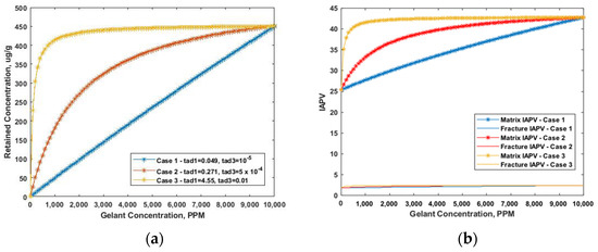 Due to gelant retention, the pore radius was reduced during placement. Thus, the IAPV dynamically increased. Based on Equation (16), we observed that the retention was influenced by both the maximum retained concentration and retention rate. Therefore, we made two sets of test cases and assumed: Frr = 1.5 with no gel formed, constant flow velocity, K ratio = 100, and MW = 20 MMD. We tested the range of the maximum retained concentration from 50 to 450 especially considering constant retention, as shown in Figure 6a. The IAPV results are shown in Figure 6b. Secondly, we tested the effect of the retention rate by considering different Langmuir model’s coefficients. The test cases are shown in Figure 7a and the IAPV results are shown in Figure 7b.