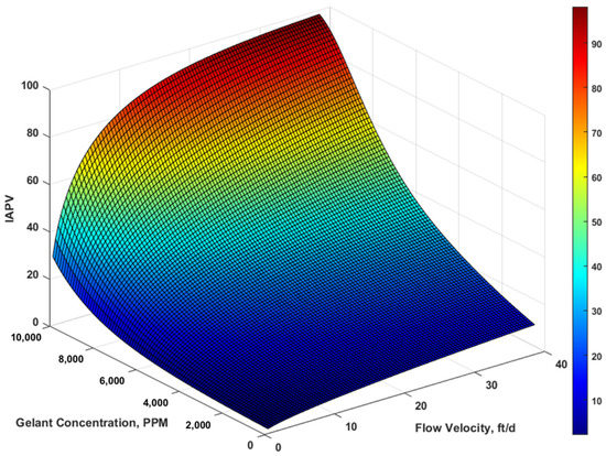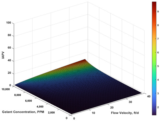 To investigate the combined effect of rheology and retention, we made a 3D surface plot using MATLAB. The horizontal axis included a flow velocity range of 0.48 to 38 ft/d and a gelant concentration range from 0 to 10,000 PPM. We observed (Figure 8 andFigure 9) that the matrix IAPV exponentially increased when gelant concentration increased, but logarithmically increased when flow velocity increased. The fracture IAPV did not significantly increase, which only demonstrates the rise of maximum concentration and flow velocity. The results were consistent with our previous analysis.