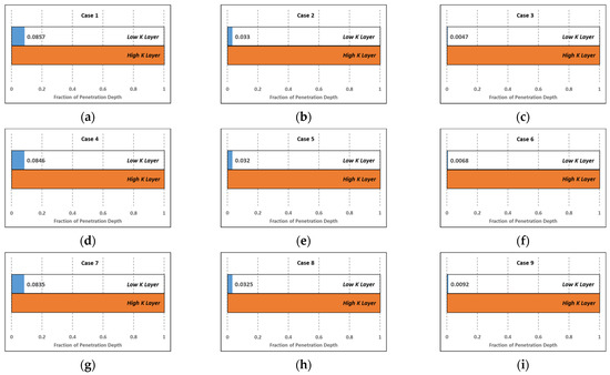 The placement results are shown in Figure 11a–i. Figure 11a–c presents the gelant placement results of case 1 to 3. As velocity increased for low concentration gelant, IAPV in the low k layer increased from 27.07 to 96.92, while IAPV in the high k layer increased from 1.84 to 8.80. The difference increased from 25.22 to 88.12. Correspondingly, the degree of penetration decreased from 0.0857 to 0.0047, which was approximately 18 times that of the reduction.