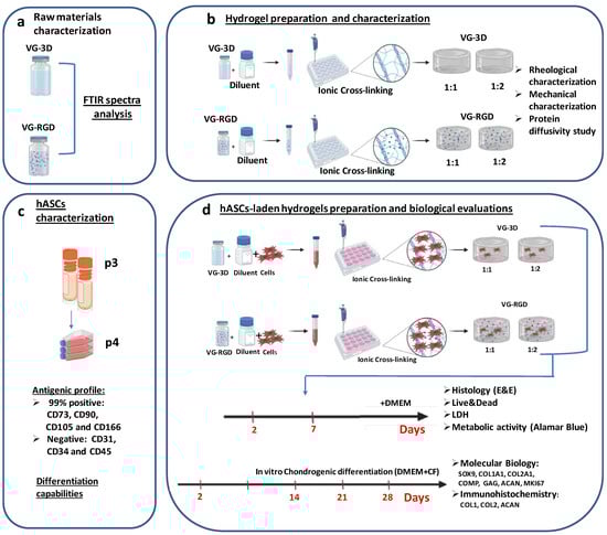 Depiction of the experimental plan: (a) characterization of raw materials through FTIR analysis; (b) evaluation of the rheological and mechanical properties of hydrogels and protein diffusivity evaluation; (c) characterization of the hASCs in terms of antigenic profile and differentiation capabilities; (d) biological analysis to assess cell distribution, viability, cytotoxicity and metabolic activity, and chondrogenic assessment evaluated through molecular biology assays and immunohistochemical staining.