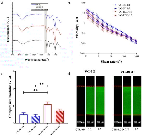 (a) FTIR analysis of lyophilized VG-3D (blue), VG-RGD (red), and control sodium alginate powder (black) obtained in the range of wavenumber from 4000 to 600 cm−1; (b) rheological characterization of VG-3D and VG-RGD materials regarding viscosity (flow curves); (c) mechanical characterization of VG-3D and VG-RGD hydrogels in terms of compressive modulus; (d) confocal images of cross-sectioned VG-3D (left) and VG-RGD (right) crosslinked hydrogels (1:1 and 1:2 dilutions) after treatment with FITC-conjugated albumin to evaluate the protein diffusivity through 3D constructs. The controls (CTR-3D, CTR-RGD) represent both hydrogels, not treated with FITC-conjugated albumin. The red dashed lines represent the hydrogel’s thickness. Data are presented as mean ± SD, n = 5; p-values are calculated by the Kruskal–Wallis method with Dunn’s multiple comparisons test, as indicated in the statistical section, ** p < 0.001.