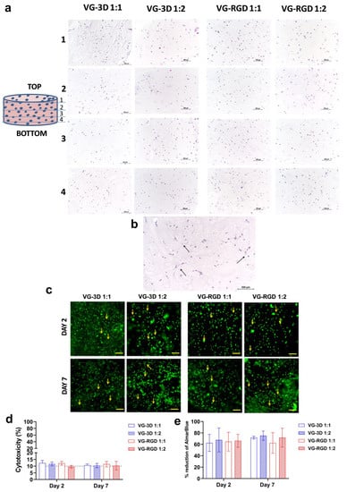 Moreover, the analysis of metabolic activity (Figure 3e) showed that at day 2 and 7, the number of metabolically active cells in the VG-RGD hydrogel (1:1 and 1:2) was similar to that found in the VG-3D hydrogels.
