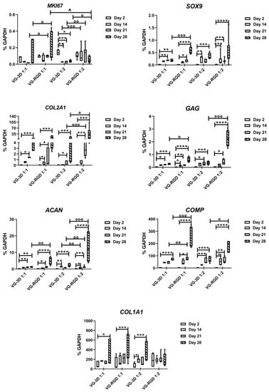 Real-time PCR analysis of MKi67, SOX9, COL2A1, GAG, ACAN, COMP, and COL1A1 genes of VG-3D and VG-RGD at day 2, 14, 21, and 28. Data were expressed as % GAPDH (housekeeping gene) and represented as a box-plot showing the median, minimum, and maximum values. The Kruskal–Wallis with Dunn’s multiple comparisons test was used for statistical analysis: * indicates differences along time points (day 2 to day 28) for each hydrogel (VG-3D and VG-RGD), ° indicates significant differences between different hydrogels (VG-3D versus VG-RGD) at the same concentration (1:1 or 1:2); ^ indicates differences between the same hydrogel at two different concentrations; n = 5, *, or ° or ^ p < 0.05, ** or °° p < 0.005, *** or °°° p < 0.0005, **** p < 0.0001.