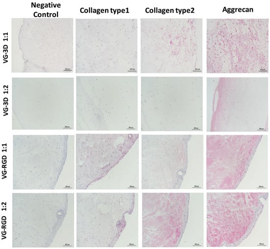 Immunohistochemical analysis of collagen type 1, collagen type 2, and aggrecan on encapsulated hASCs in VG-3D and VG-RGD hydrogels (1:1 and 1:2) at day 28. The negative control was included. Pink areas = positive immunostaining; scale bars = 200 µm.