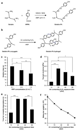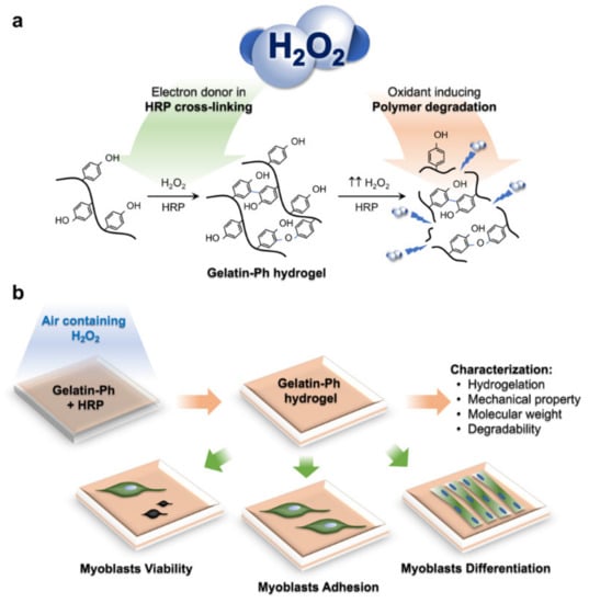 - Mubarok, W.; Qu, Y.; Sakai, S. Influence of Hydrogen Peroxide-Mediated Cross-Linking and Degradation on Cell-Adhesive Gelatin Hydrogels. ACS Appl. Bio Mater. 2021, 4, 4184–4190. [Google Scholar] [CrossRef]