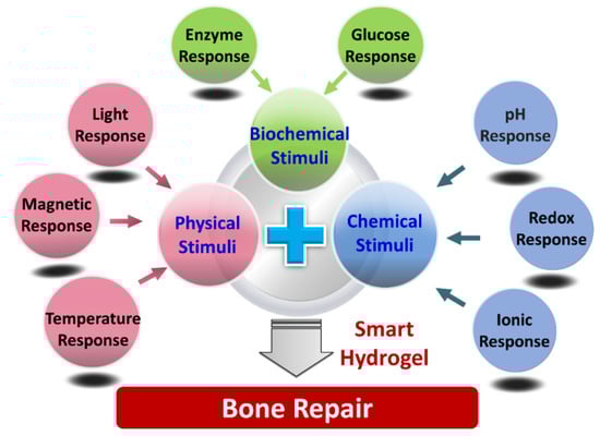 According to the types of stimulus sources, hydrogels are mainly divided into three categories (Figure 1): physical responsive hydrogels, chemical responsive hydrogels, and biochemical responsive hydrogels []. Since 1960, when Wichterle published the landmark article [], the hydrogel has gradually developed from a simple, inert gel material to a complex, variable and controllable “smart” gel material with sensitive or responsive properties, which has been gradually introduced into the field of bone defect repair. It can respond to external physical stimuli (light, temperature, pressure, electric field, magnetic field, etc.), chemical stimuli (pH, redox response, ions, etc.), and biochemical stimuli, glucose, enzymes, etc.), and conduct shape transformation, produce injectability, and exhibit self-healing and shape memory properties to perform complex bone defect repair treatment that is minimally invasive; thus, it has become an emerging scaffold material in bone tissue engineering [].