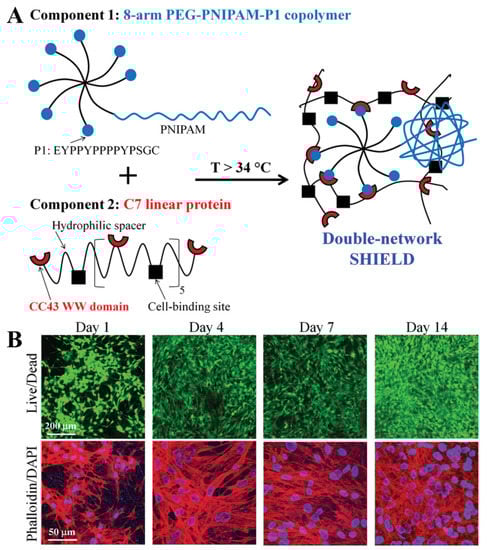 Retention of transplanted stem cells enhanced by thermo-responsive injectable hydrogels with in situ double network formation. (A) Structural design of SHIELD. (B) Confocal images of hASCs cultured in SHIELD. Reproduced from [] with permission. Copyright 2015 Wiley.