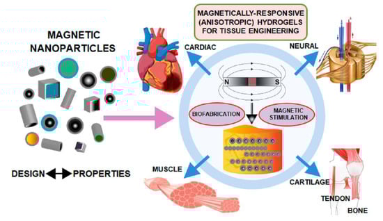 Schematic illustration: use of magnetic hydrogels to engineer different tissues of the human body. Reproduced from [] with permission. Copyright 2021 American Chemical Society.