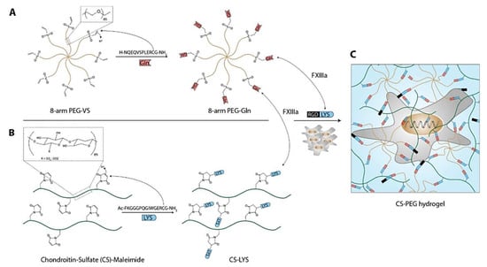 Factor XIII mediated CS-PEG hydrogel formation. The functionalization of (A) 8-PEG-VS with TG-Gln peptides resulted in 8-PEG-Gln and (B) CS-maleimide with CS-MMP-Lys in CSn-MMP-Lys. (C) Formulations of 8-PEG-Gln, CS-MMP-Lys, and the cell adhesion ligand TG-RGD-Lys were crosslinked by FXIIIa in presence of cells to form 3D cellular microenvironments. Reproduced from [] with permission. Copyright 2016 Elsevier.