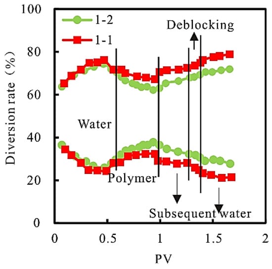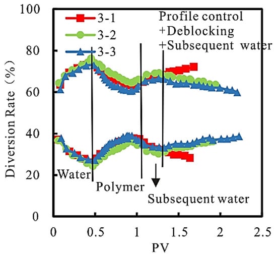 The relationship between the diversion rate and PV at the produced end of the model at each stage of the experiment is shown in Figure 8.