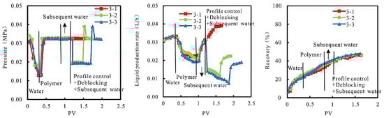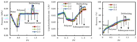 In the experimental process, the relationship between injection pressure, liquid production rate, and recovery, and PV is shown in Figure 6.