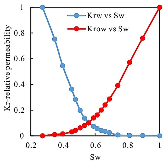 CMG software was used for numerical simulation. The geological model is divided into rectangular grids. The grid number of the local numerical model of well W-4-2 is 83 × 43 × 17 = 61,564, and the plane grid size is 10 m × 10 m. Parameters such as thickness, porosity, permeability, and oil saturation of each layer were obtained from field test data, and the production history of the well since it was put into production was fitted. The rock and fluid property parameters of the local polymer injection block in well W-4-2 are set in Table 6. The relative permeability curve is obtained from the data provided by the oil field, which determines the law of oil-water flow in the process of numerical simulation. Oil-water relative permeability curve is shown in Figure 9.