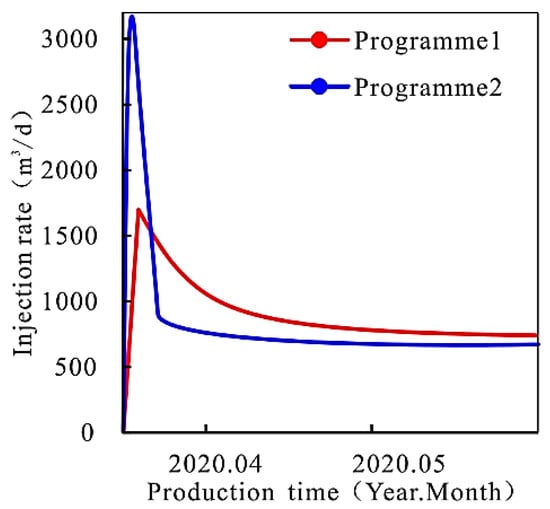 On 3 March 2020, 80 m3 depolymerization agent was injected into target well W4-2 for 6 h of injection time and 10 h of soaking. The average polymer concentration in the area near-wellbore before and after plugging in well W4-2 is shown in Table 7, and the relationship between injection speed and time is shown in Figure 10.
